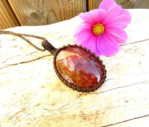 Spectacular earth bohemian Red Hematoid Quartz necklace - Red Hematoid Quartz is Quartz that contains Hematite - which gives the Quartz its rich, deep red colour. This Hematoid Quartz has contains dramatic, flashy layers that flash in the light and there are numerous rainbow prisms 🌈 Both the front and backside of the stone is beautiful (*reversible!) Such a treasure! Also referred to as : Red Fire Quartz