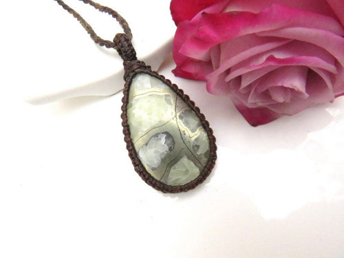 Rare and beautiful pyritized Ammonite macrame necklace - Ammonites are fossilized oceanic creatures that lived in the ocean approximately 400 million years ago. This is an Ammonite shell that is 'pyritized' or, rather, pyrite has migrated along the chambers of the Ammonite shell. As this is considered a rare occurrence in nature, Ammonite-pyrite is an incredible piece to add to your gemstone collection ! One of a kind ✨