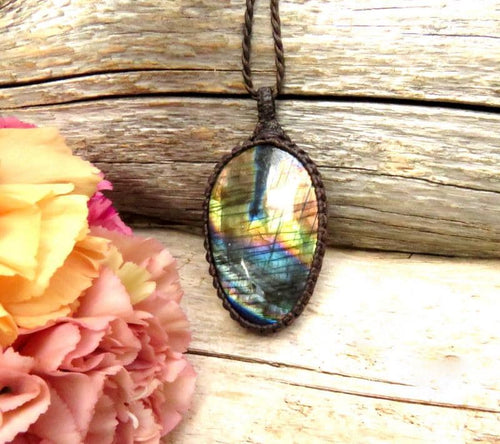 Stunning quality rainbow Labradorite macrame necklace - BEAUTIFUL, bright 'fire' or flash! ELECTRIC blue,green and golden orange with RARE purple -reminiscent of the most beautiful rainbow of colors or the most beautiful sunset You will receive the exact stone in photos #1-6 and the video.