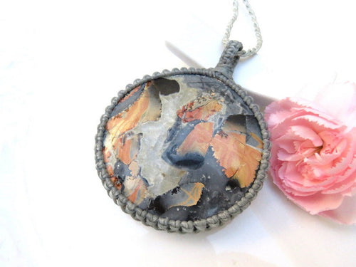 Magnificent Maligano Jasper macrame necklace ! Rare Maligano Jasper from Sulawesi Island, Indonesia. This stunning and rare Jasper has very unique patterns and colors - soothing gray with peachy orange! Very generous size ✨💎