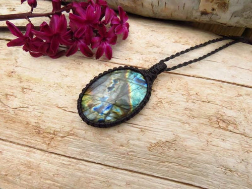 BEAUTIFUL Quality Rainbow Labradorite macrame necklace - gorgeous ELECTRIC blue, green and PURPLE flash or 'fire' ๐งก๐๐๐ - classic oval shape - Simply Divine ! The flash of color (or 'fire') is affected by the angle and lighting in which its held . * You will receive the exact piece in photos #1 - 6 and the video.