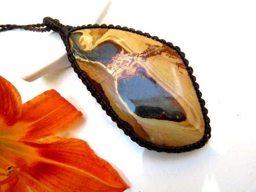 Spectacular Soldier Mountain Jasper macrame necklace - A collectors piece from Sevier County, Utah, USA. Defined lines, dramatic, scenic landscape. Creamy tan and smokey, dark blue. Generous size and unique - a rare and unique designer piece !