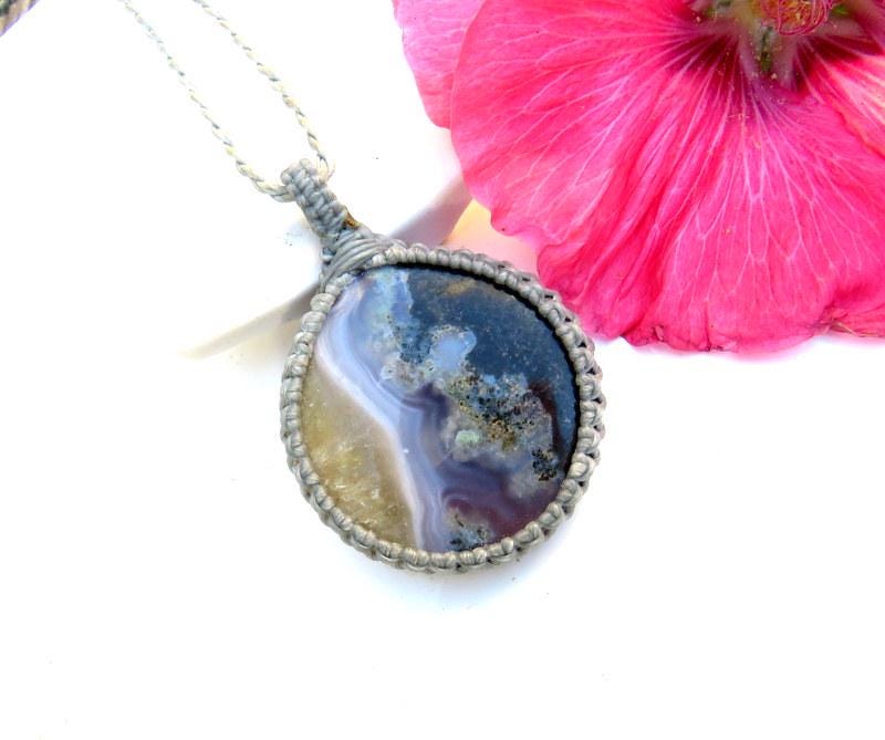 Materials: agate, cabochon, waxed cord, gemstone, plume agate, purple agate.