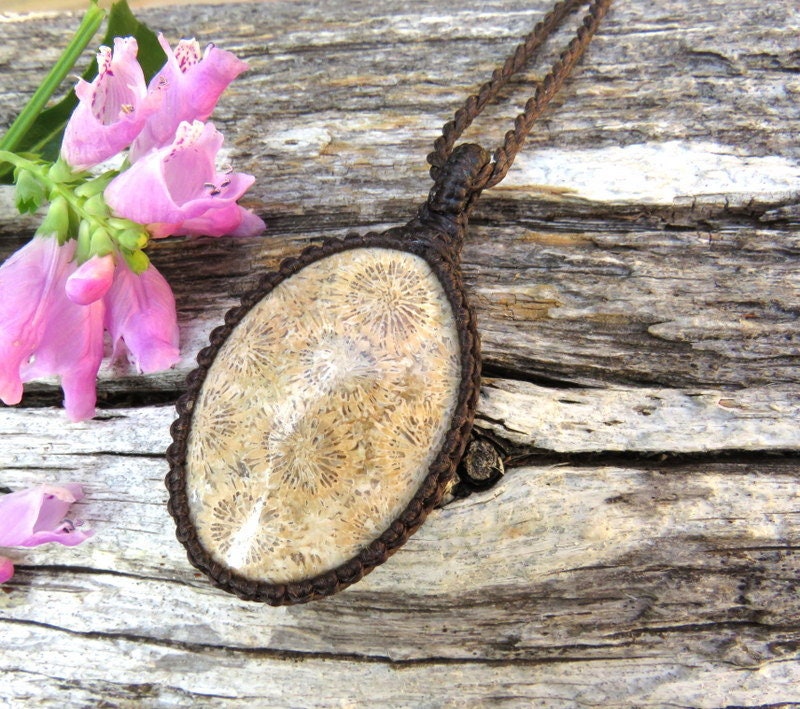 Beautiful Agatized Coral macrame necklace - This fossilized coral gemstone is a lovely, earthy tan with multiple crisp 'florets' of agatized Coral ! Agatized coral begins its journey as living coral polyps in ancient oceans. Agatized coral typically retains the original shape and structure of the coral polyps - resulting in beautiful and detailed patterns. The patterns within Agatized Coral can be stunning, resembling floral or organic motifs with intricate branch-like structures, tubes, or honeycomb patterns. These patterns are highly valued in jewelry and lapidary art.