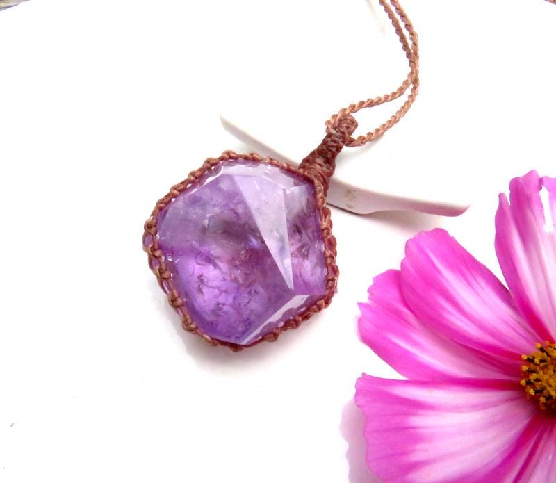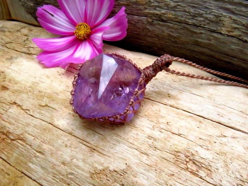 Materials: amethyst, gemstones, semiprecious stones, waxed cord, crystal.