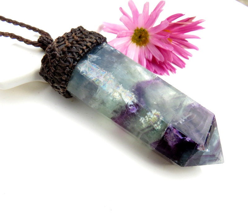 🌹This listing for a stunning Rainbow Fluorite macrame necklace - this magical Fluorite crystal point necklace is a rainbow of beautiful colors - deep purple, teal green and hues of blue - and is FULL of gorgeous rainbow prisms. 🌈(*far more than our camera and video captured) So much prettier in person ! The colors, banding and patterns (and prisms!) are exceptional! In Latin, 'fluorite' means 'to flow' - reminding us to 'flow with it all.' You will receive the exact crystal in photos #1-7 and the video.