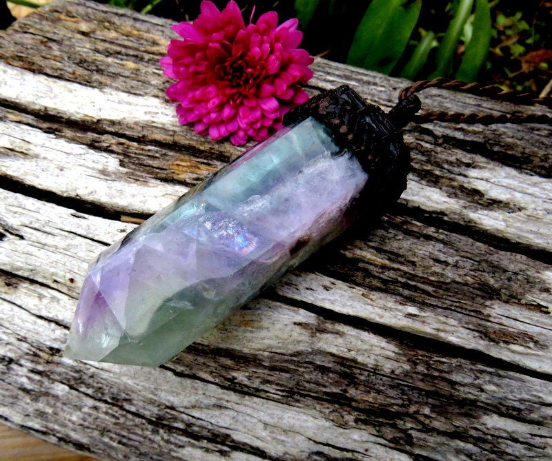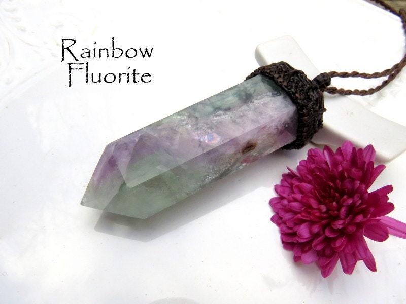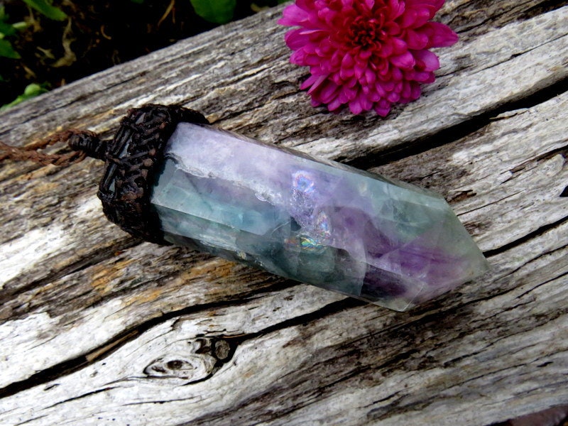 This listing for a stunning Rainbow Fluorite macrame necklace - this magical Fluorite crystal point necklace is a rainbow of beautiful colors - deep teal green, purple and FULL of gorgeous rainbow prisms. 🌈 So much prettier in person ! The colors, banding and patterns (and prisms!) are exceptional! In Latin, 'fluorite' means 'to flow' - reminding us to 'flow with it all.' You will receive the exact crystal in photos #1-7 and the video.