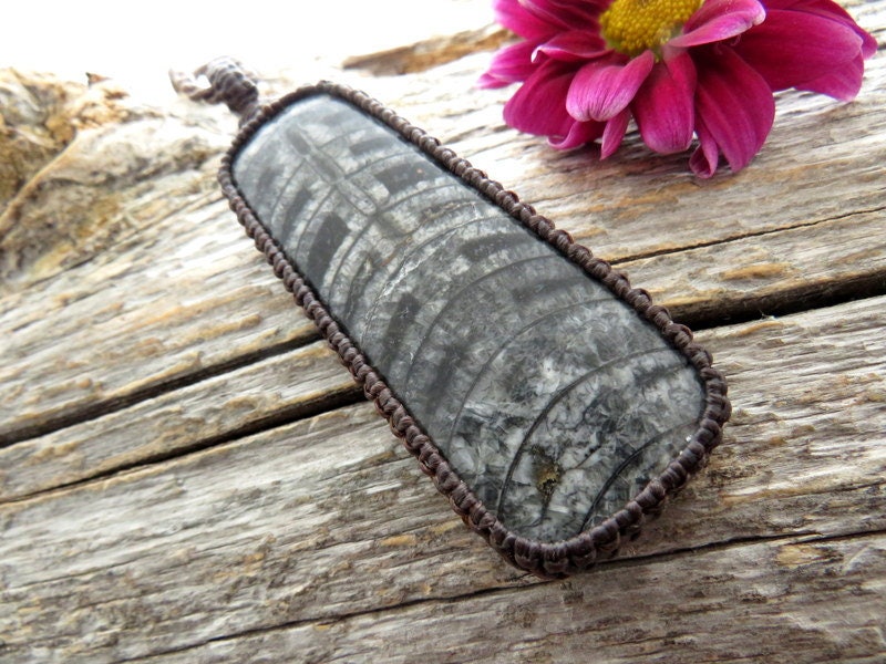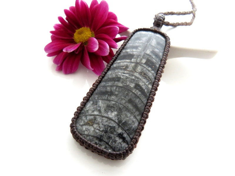 New to the Earth Aura collection ! Unique Orthoceras Fossil macrame necklace - Orthoceras fossils have been found dating back to the Ordovician period ( 400+ million years ago) Even though they were among the earliest forms of life, this class of nautiloid is still considered to be one o f the most intelligent forms of ocean life. Fossils (from Latin fossus, literally ”having been dug up”) are the preserved remains or traces aces of animals, plants, and other organisms. In ancient times believed to be a gift from the stars and because of their age they have been used throughout the centuries as a talisman for protection and long life.