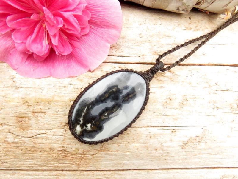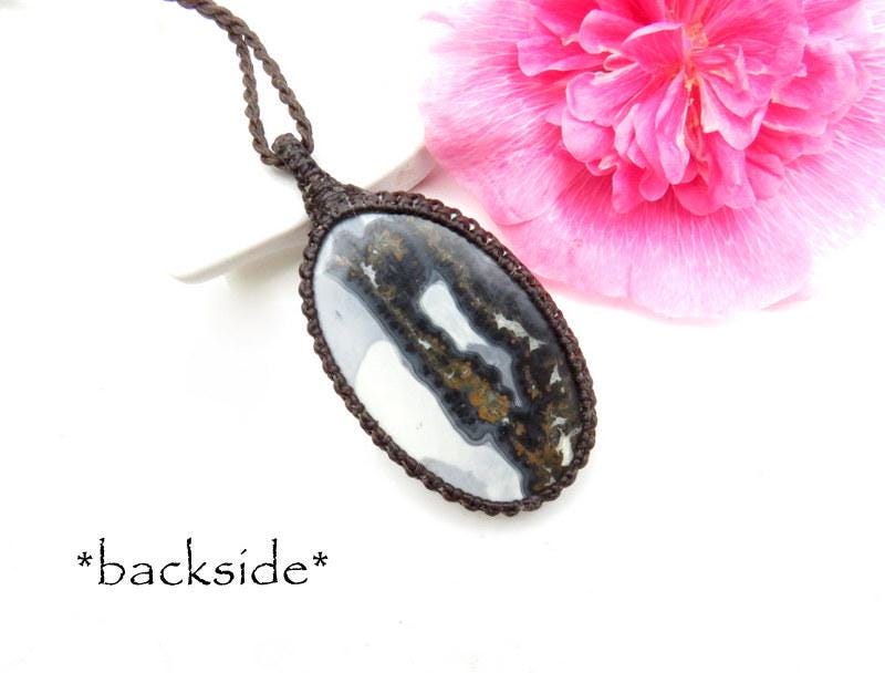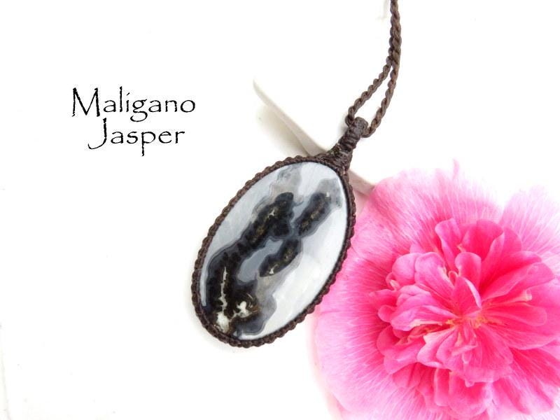 Grounding & protective - Maligano Jasper macrame necklace ! Rare, soothing gray and black Maligano Jasper from Sulawesi Island, Indonesia. Contains magnificent, intriguing patterns that are quite unlike any other gemstone - One of a kind !