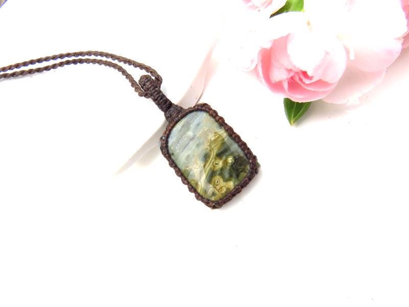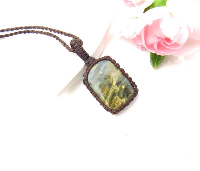 Unique Ocean Jasper macrame necklace ! Gorgeous green and yellow with fun orbs and intriguing patterns !