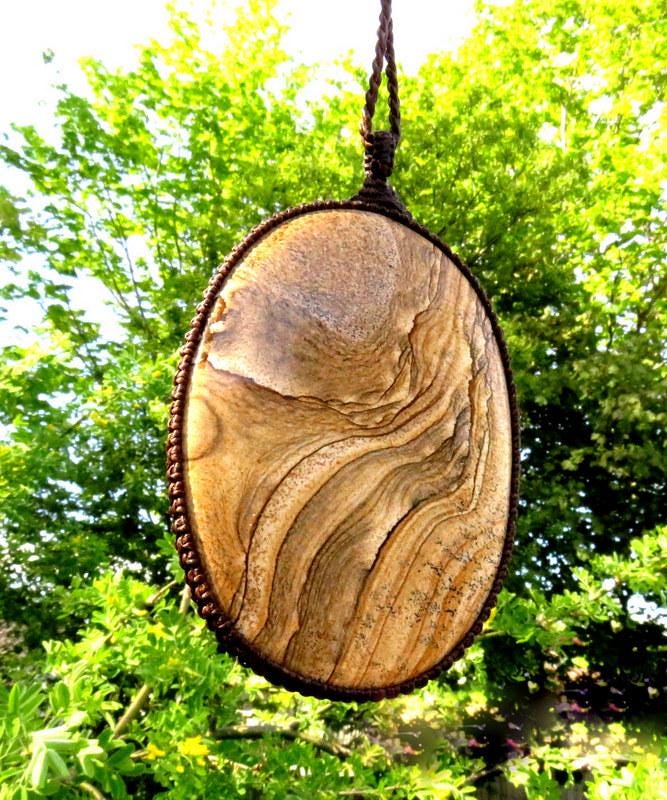 A gorgeous Picture Jasper macrame necklace! A lovely, picturesque landscape - earthy browns with crisp patterns and a very generous size. These pieces are exceptional. Landscape Jaspers are a type of Jasper that’s known for its picturesque images that often evoke landscapes. These types of Jasper have an interesting origin. It appears that the material was originally in a colloidal form after water swept through volcanic ash and collected iron and silica in a colloidal solution. After the next eruption, the water contained within it was released as super-heated steam, causing various ripples as the pressure and heat washed over them. Our cool mother earth 🌍