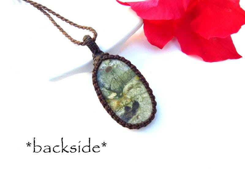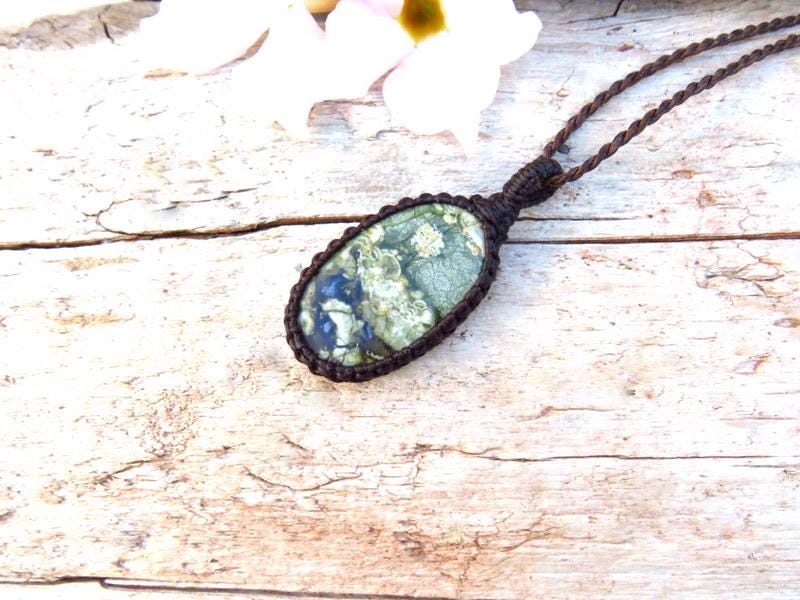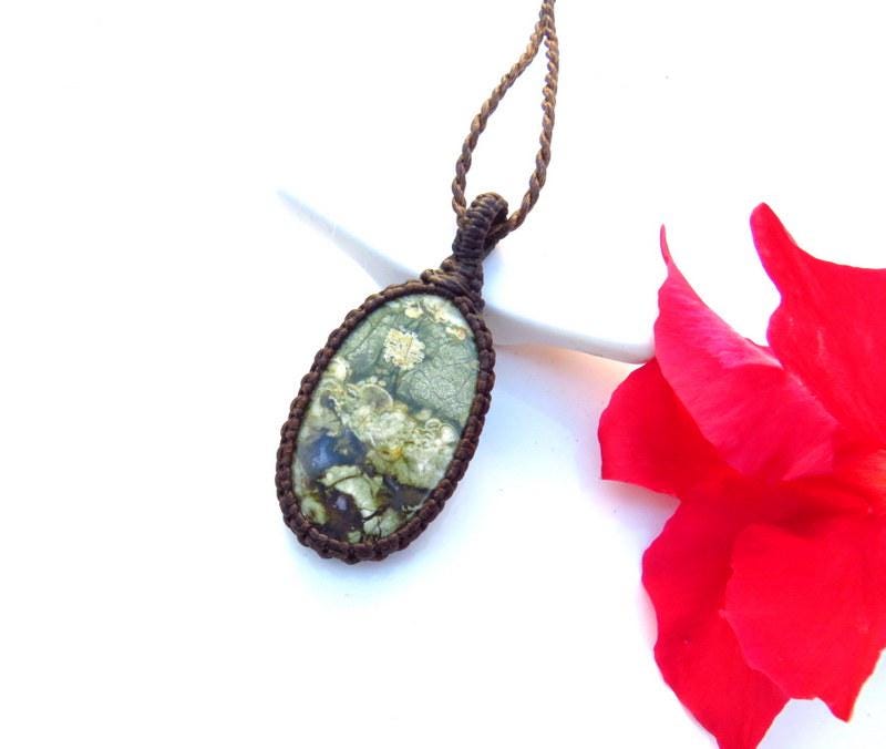 Sweet Rainforest Jasper macrame necklace - So many shades of green ! Earthy and unique! Also known as Green Rhyolite, Rainforest jasper was created from a molten flow of magma from the now extinct Mount Hay volcano near Queensland, Australia (about 120 million years ago!)