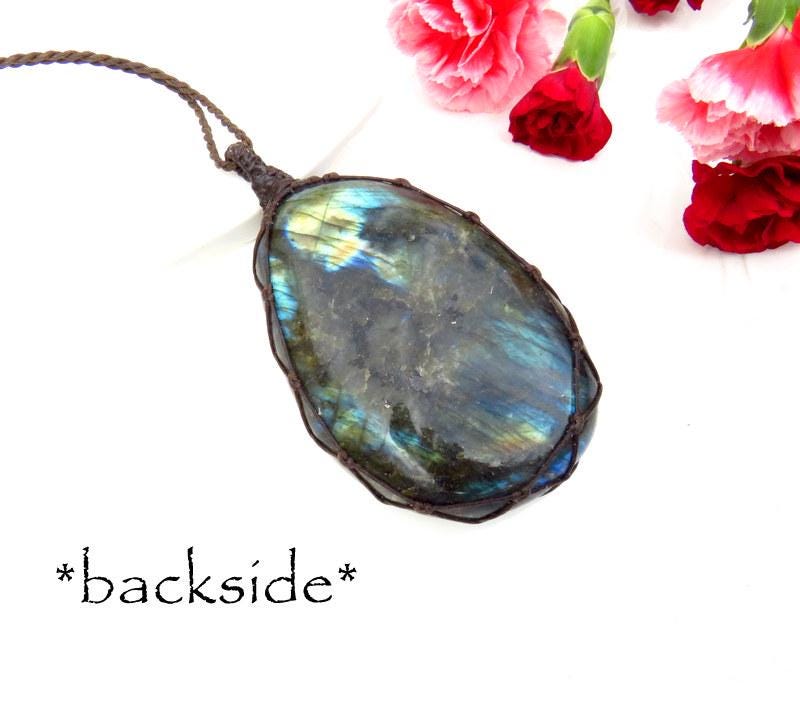 Lovely Labradorite macrame necklace - bold, fiery flash of electric blue and green with unique patterns - Gorgeous, oval palm stone shape and a very generous size 💙