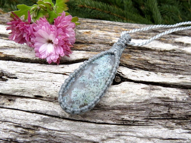 Perfect for the nature lover ! This lovely Moss Agate macrame necklace is reminiscent of a mossy green forest floor ! This Moss Agate stone is filled with colorful mineral plumes suspended in translucent Agate. Gorgeous, grounding and a fantastic find! ✨