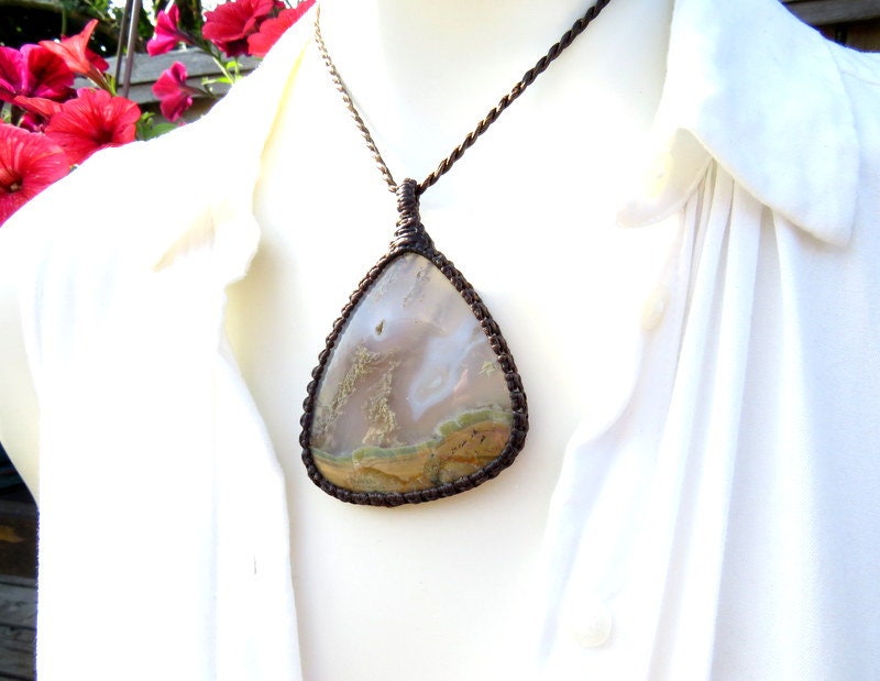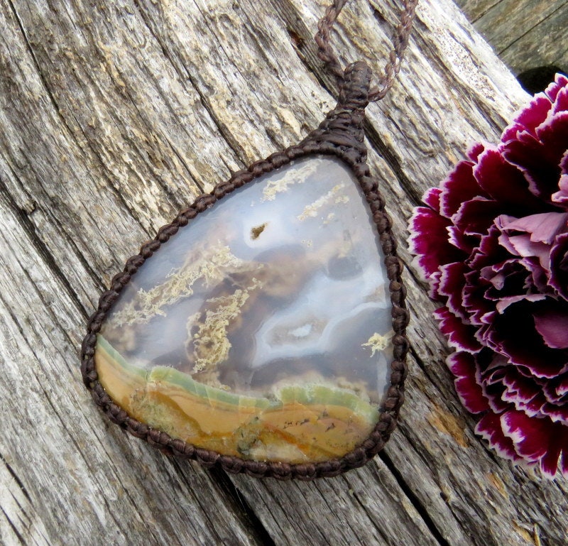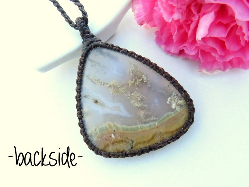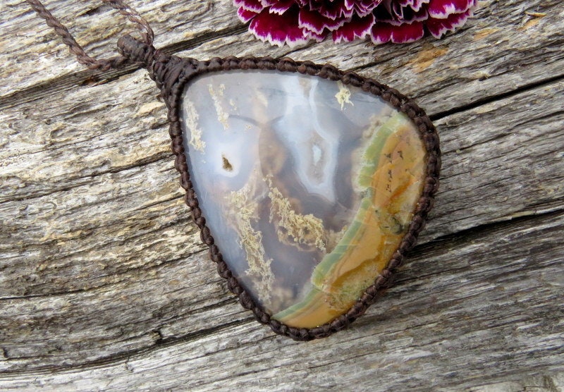 💚NEW BEGINNINGS 💚Spectacular Plume Agate macrame necklace - Plume Agate contains branching mineral inclusions("plumes") and patterns that resemble moss, little trees or other vegetation...This Plume Agate has and abundance of earthy plumes and inclusions ~ A great gift for the gardener or nature lover ~ : )