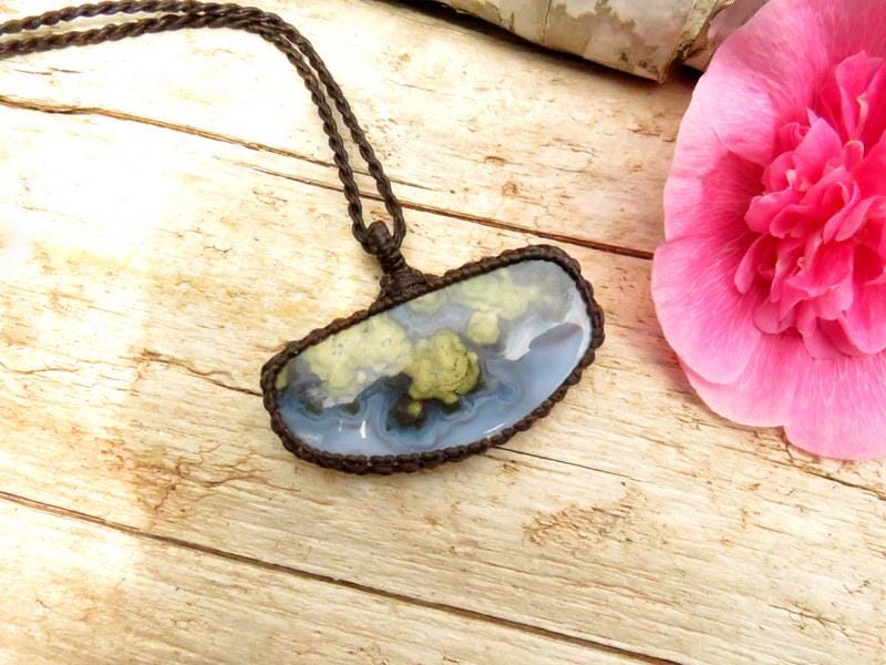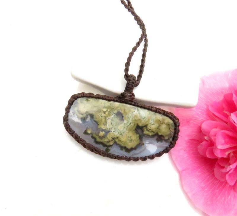 Perfect for the nature lover ! This glorious Plume Agate macrame necklace is full of colorful plumes and patterns - a unique shape and a generous size! 🌿 Plume Agate's captivating and earthy aesthetic and its connection to the natural world make it a unique and sought-after gemstone for jewelry and metaphysical purposes. 🌿✨