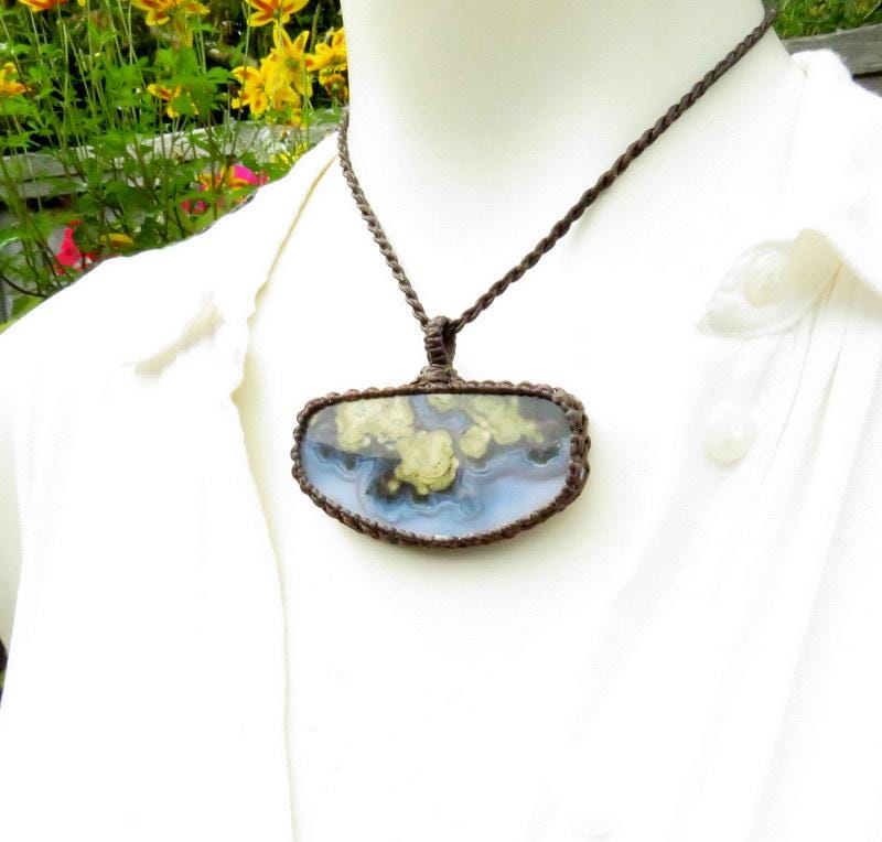 Materials: agate, cabochon, plume agate, waxed cord.