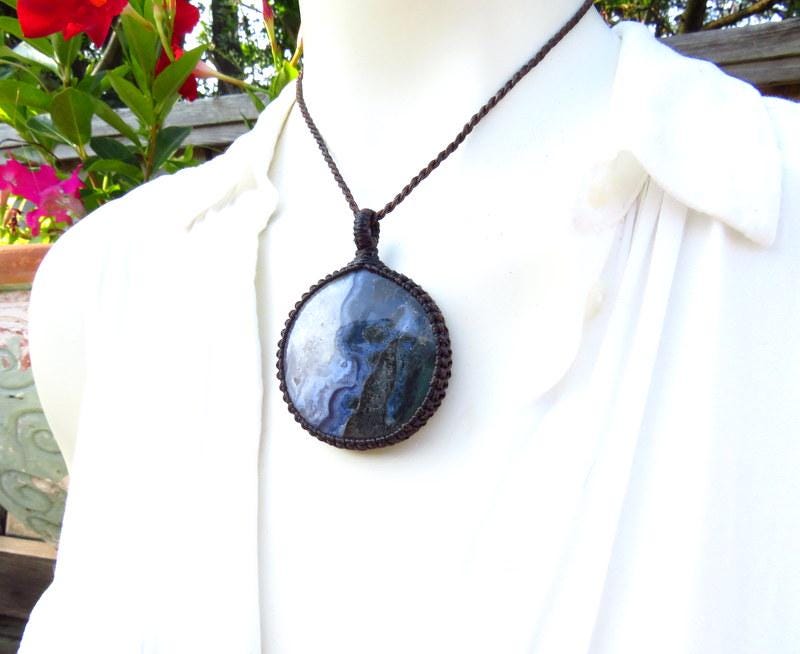 Materials: agate, moss agate, cabochon, waxed cord, gemstone.
