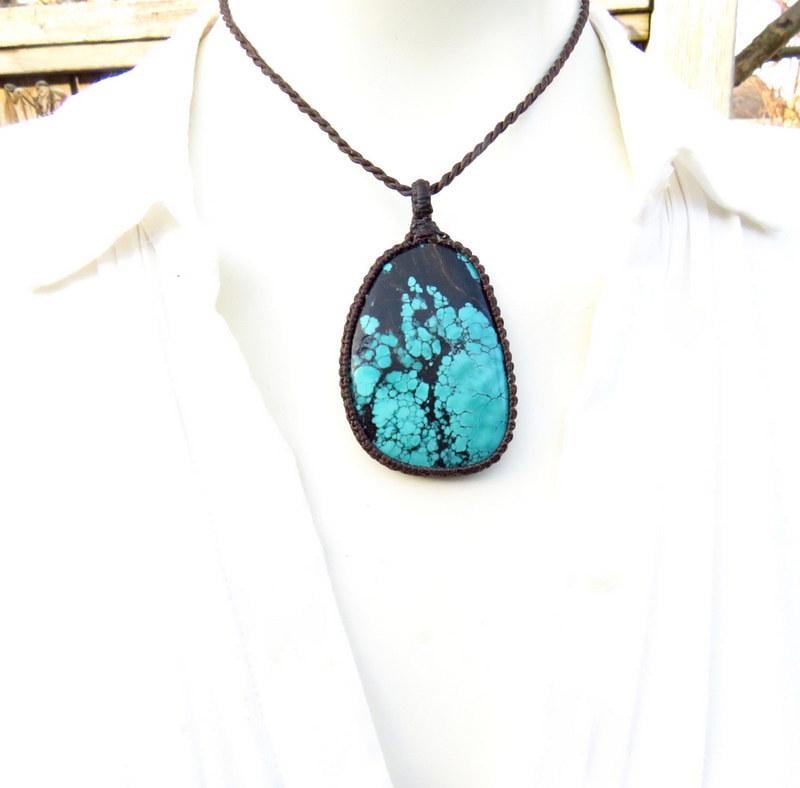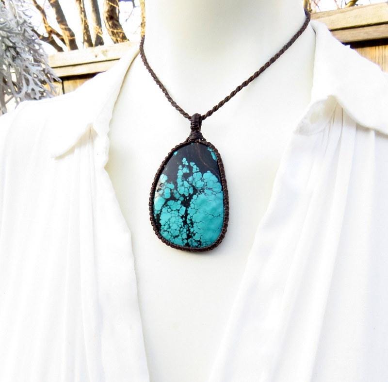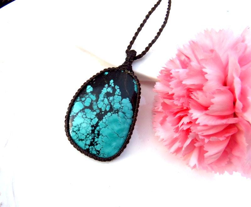 Beautiful Cloud Mountain Turquoise macrame necklace - beautiful color and web patterns and a very generous size ! Cloud Mountain Turquoise comes from a mine in the Hubei Province in central China that has been the most prolific Turquoise mine in Asia. ✨