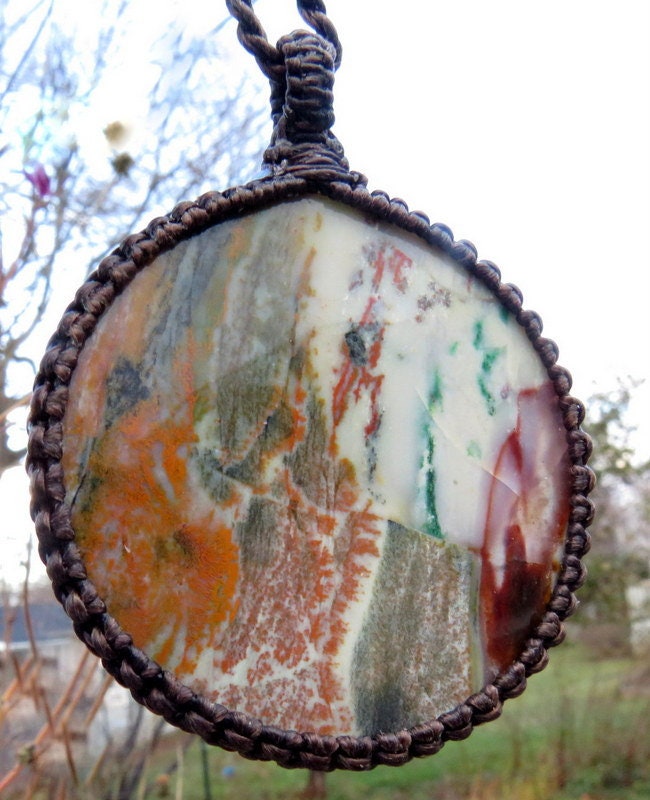 Beautiful are rare Petrified Wood gemstone macrame necklace! So many colors - orange, brown, green, red and gray - such intriguing patterns and colors!
