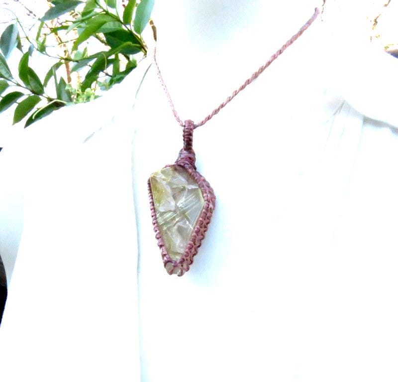 ✨STRENGTH & DETERMINATION✨ Freeform Golden Rutile Quartz macramé necklace - Crystal clear quartz crystal point filled with flashy golden threads of Rutile . Rutile is a mineral that grows inside of Quartz - it always grows in straight , strong lines - Amazing mother earth ~:) Would make a great gift idea for the crystal collector or a Valentine's Day gift 💖