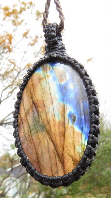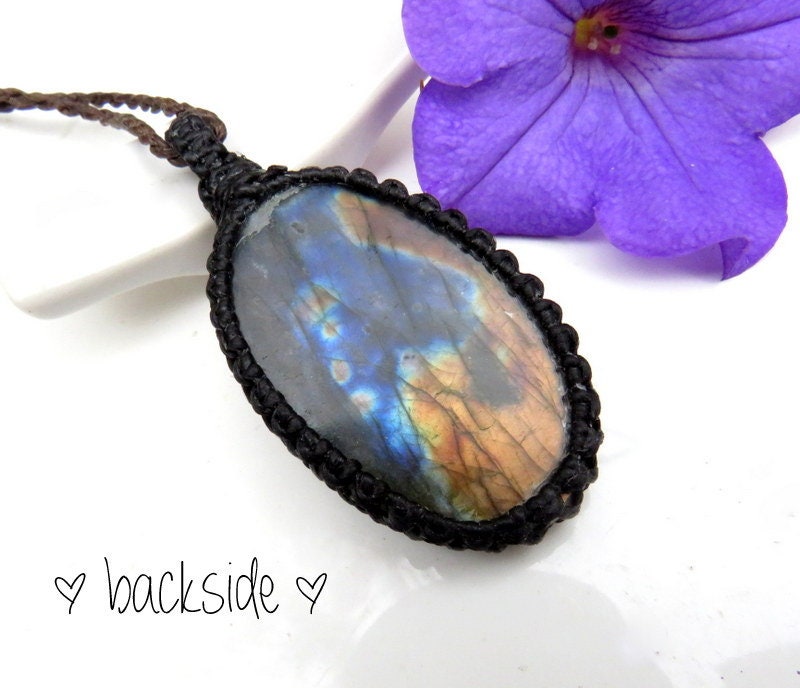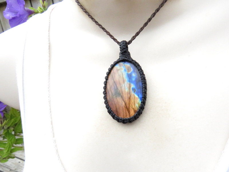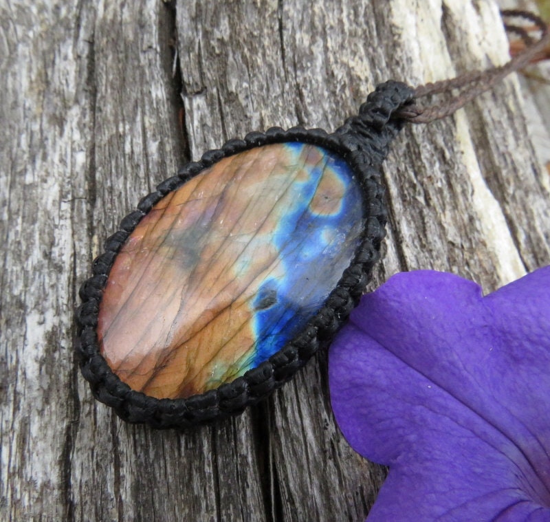 ✨TRANSFORMATION & CHANGE✨ STUNNING - Labradorite macramé necklace - Mesmerizing golden orange fire with electric blue - classic oval shape - Stunning, sweet Labradorite find ! 💙💙💙 You will receive the exact stone in photos #2-7 and the video. **Please note that this Labradorite is wrapped in black cord but in the listing photos the necklace (cord) is brown - you will receive a black cord with this Labradorite.