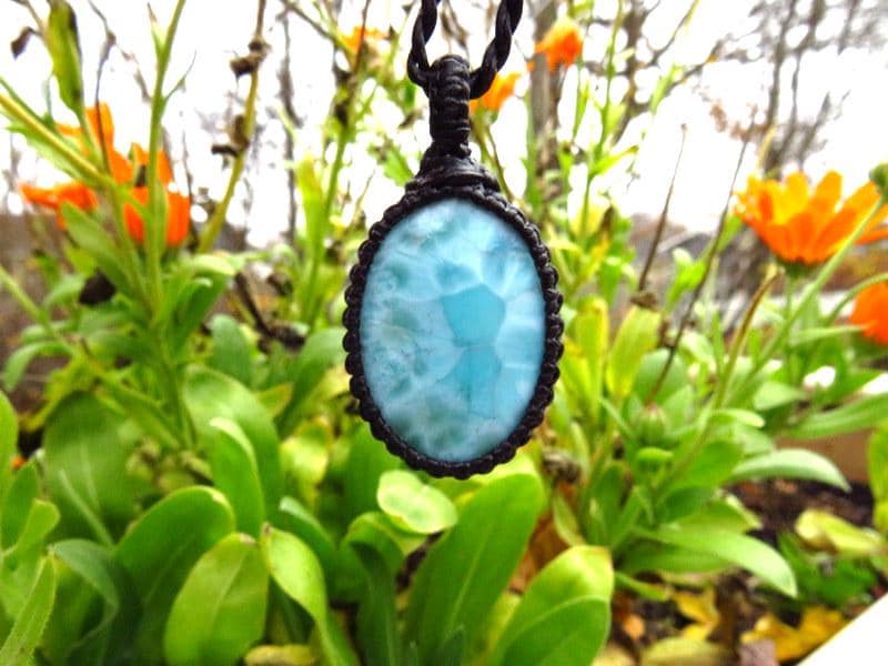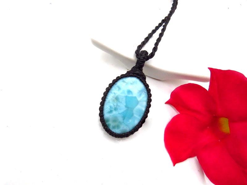 🐬PEACE, LOVE & SERENITY 🐬Superb quality! Larimar macrame necklace - Reminiscent of a rippling Caribbean blue-green sea - Also known as the 'Dolphin Stone' - Besides its alluring colour, Larimar is a also a powerful and energetic stone ! This piece is a lovely tropical blue 💙 The price of Larimar reflects its rarity and how difficult it is to mine. Only found in the Dominican Republic and mined only by hand - in a very difficult area to access- Larimar is considered to be among the rarest gemstones in the world. Psychic Edgar Cayce (1877 - 1945). predicted that on one of the Caribbean islands a blue stone would be found with extraordinary healing attributes and it is believed that Larimar is the stone that Cayce was speaking of. **You will receive the exact Larimar in photos #1-6 and the video.