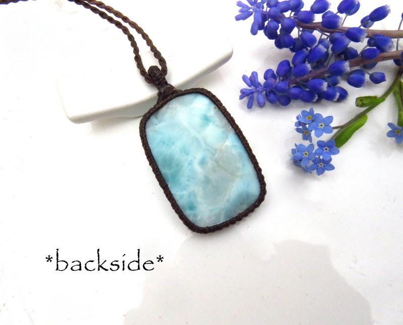 ✨PEACE, LOVE & SERENITY✨ Magnificent Larimar macrame necklace - Also known as the 'Dolphin Stone' - the prettiest Caribbean blue with its distinctive honeycomb pattern that resembles rippling ocean waves - only found in the Dominican Republic and mined only by hand - in a very difficult area to access- Larimar is considered to be among the rarest gemstones in the world. Psychic Edgar Cayce (1877 - 1945). predicted that on one of the Caribbean islands a blue stone would be found with extraordinary healing attributes and it is believed that Larimar is the stone that Cayce was speaking of. ✨ You will receive the exact stone in photos: #1-6(model is wearing a different Larimar)