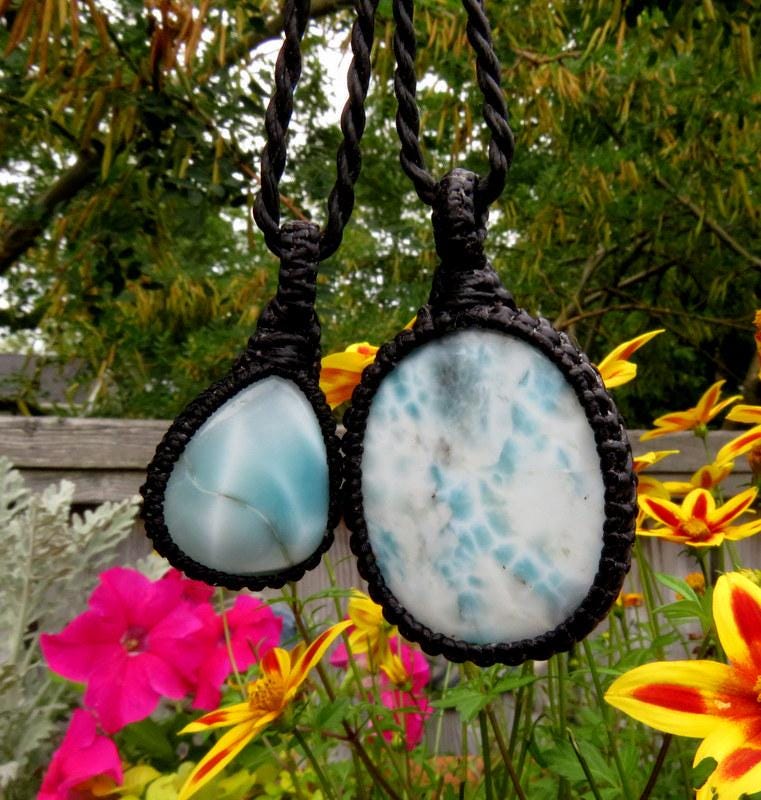 🌊PEACE, LOVE & SERENITY 🌊This listing is for TWO beautiful Larimar macrame necklaces - These 2 necklaces can be worn stacked/layered together or worn separately - also a lovely idea for best friends and soul-mates - and also a great size for kids! *You will receive BOTH (2) pieces with the cord length of your choosing for each (if you wish for different lengths, please indicate in the 'notes to seller' box in your cart or send us a message! ) In the listing photos, we are showing the set with the 18 inch and 22 inch cords.