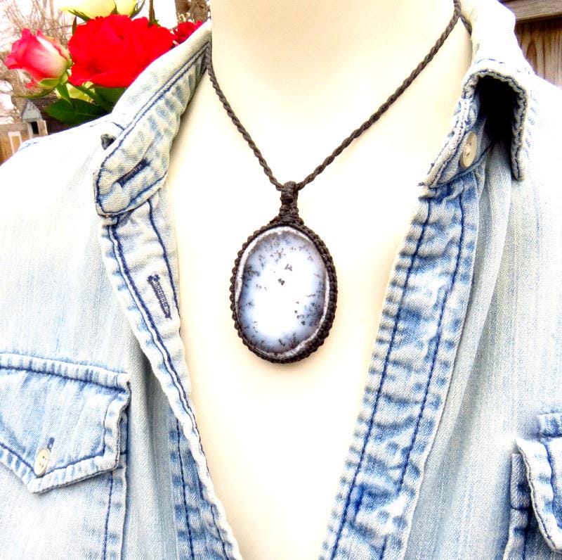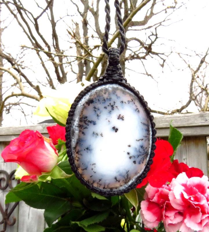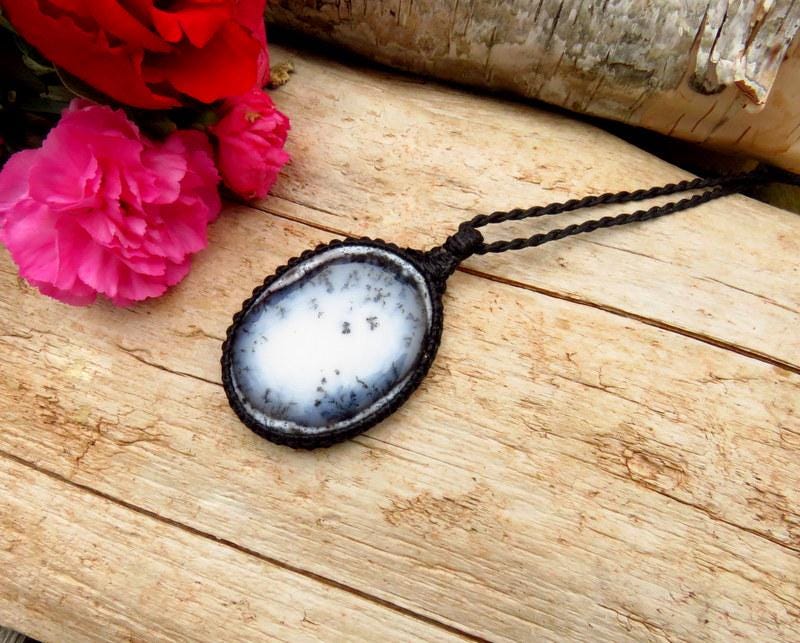 🌱GROWTH & CHANGE 🍂 A beautiful Merlinite Shaman (or, Dendrite Opal) macrame necklace - You will receive the exact piece in photos #1-7 and the video. Imagine a delicate slice of opal with these intricate, fern-like patterns that seem to dance across its surface - a whimsical forest scene, full of tiny, fantastical trees and leaves, all swirling in a delightful, organic chaos. These patterns, known as "dendrites," are actually mineral inclusions that have been cleverly disguised as delicate, ancient tree branches or delicate ferns. They turn each piece into a tiny, personal landscape, inviting you to get lost in its detail. Wearing Dendrite Opal is like carrying a miniature enchanted forest with you—a piece of Earth’s artistry that’s both playful and profound.