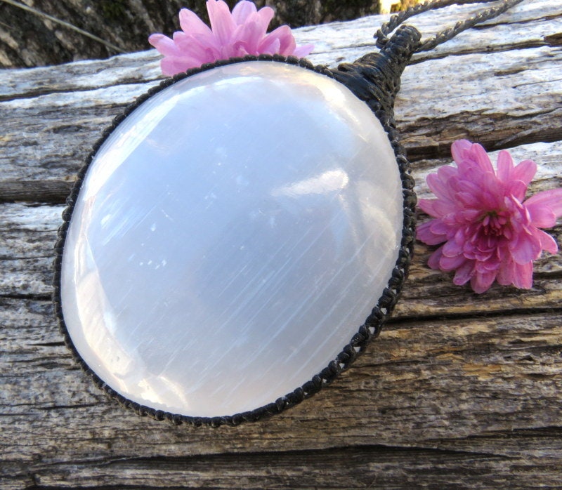 🦋PEACE & ANGEL COMMUNICATION 🦋 So lovely ! Pretty Selenite macrame necklace - A moonlight white - the Greek word Selenite means 'moon rock' or 'moon stone' - and this piece certainly has a pearly lustre that glows like the moon ! You will receive the exact crystal in photos #1-6 and the video (*model is wearing a different but very similar Selenite crystal)