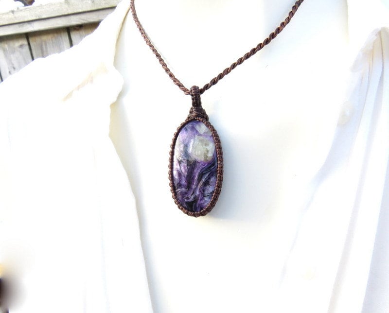 Materials: charoite, waxed cord, cabochon, semiprecious stones, gemstones.