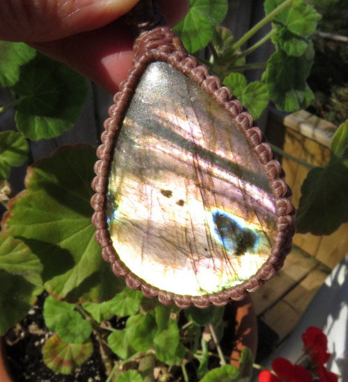 TRANSFORMATION & CHANGE & CRUSHING GOALS 💎Superb quality Labradorite macrame necklace - the color combo of this Labradorite is stunning- fiery, purple and golden orange flash with blue and green - classic teardrop shape - Simply Divine ! You will receive the exact crystal in photos #1-7 and the video. You will also receive a beautiful write up describing the healing properties of your new gemstone.