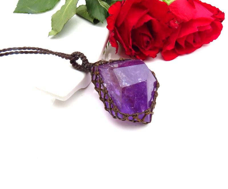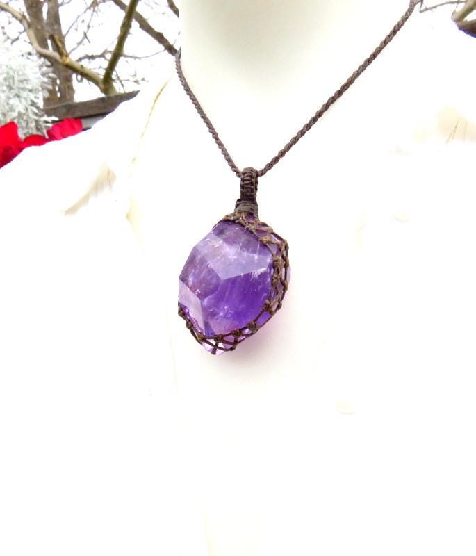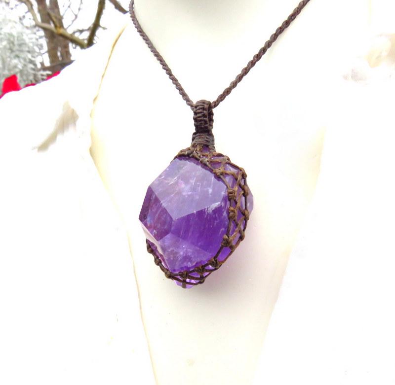 Materials: amethyst, gemstones, semiprecious stones, waxed cord, crystal.