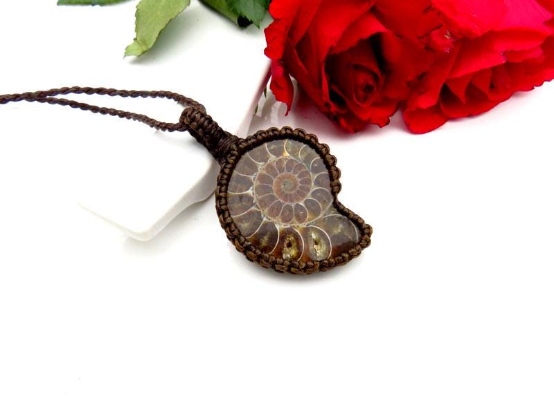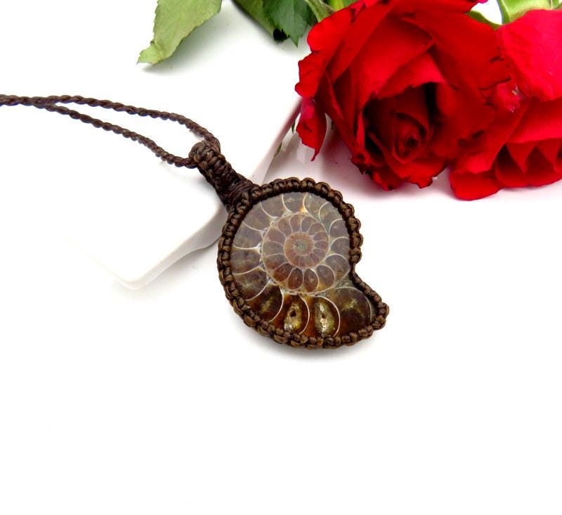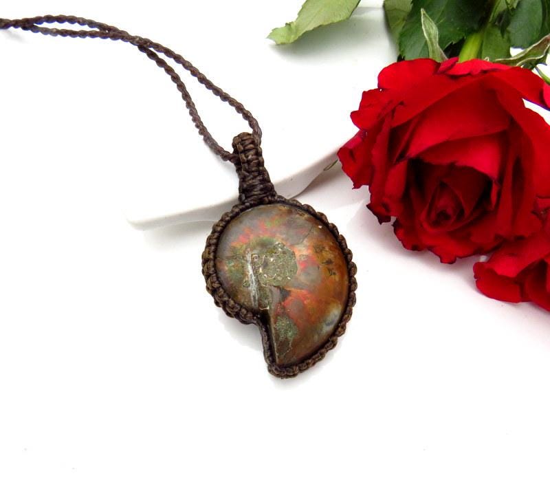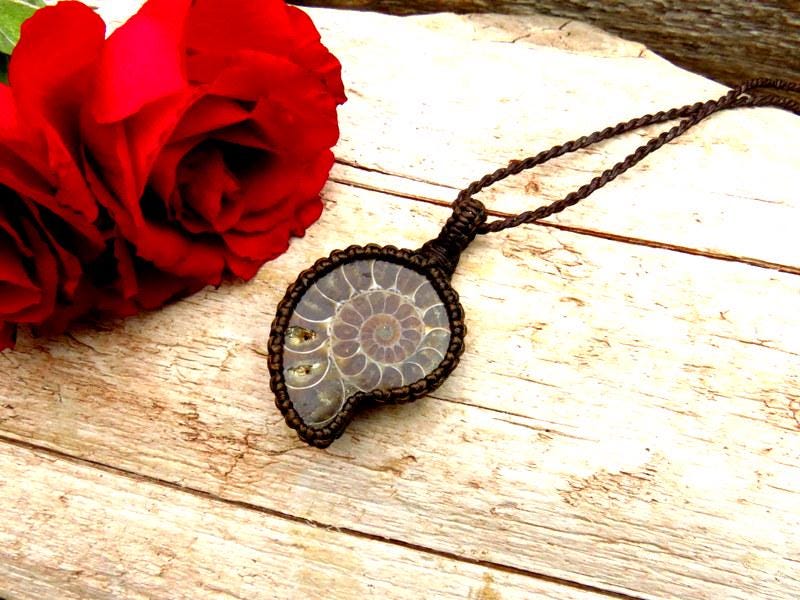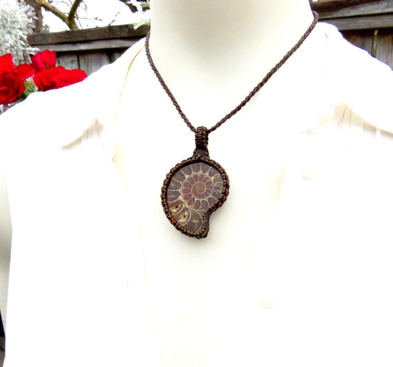 Beautiful Ammonite necklace - So fun to gaze at the spiral rays and imagine sea life 400 million years ago. The Ammonite macrame necklace is a stunning marriage of history and artistry. This unique piece features an Ammonite fossil, intricately woven into a macrame setting. This Ammonite necklace is like wearing a piece of our ocean's history that has been ✨macrame-magically✨ transformed into a conversation piece! A testament to the beauty of the past adorning the present.💗 In addition, the backside of this piece has pretty iridescence !