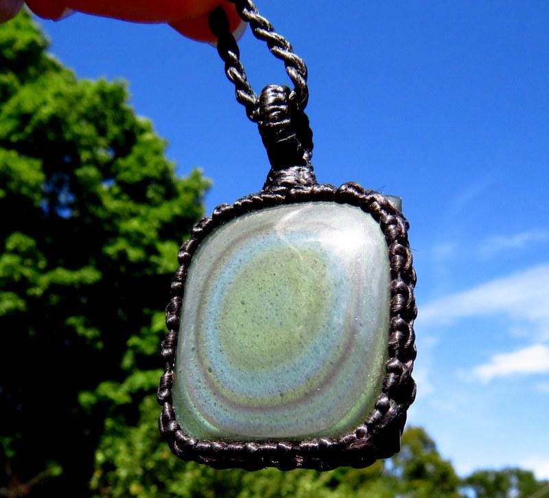 This listing is for a lovely Rainbow Obsidian macrame necklace! Rainbow Obsidian enchants with its stunning display of colors that dance across its dark surface like a celestial kaleidoscope. Imagine holding a piece of the night sky in your hand, adorned with shimmering bands of iridescence that seem to shift and shimmer with every movement. Rainbow Obsidian serves as a potent reminder of the beauty and resilience of the human spirit. It is a stone of transformation and renewal, inviting us to embrace the full spectrum of our emotions and experiences and to find beauty in the darkness.✨