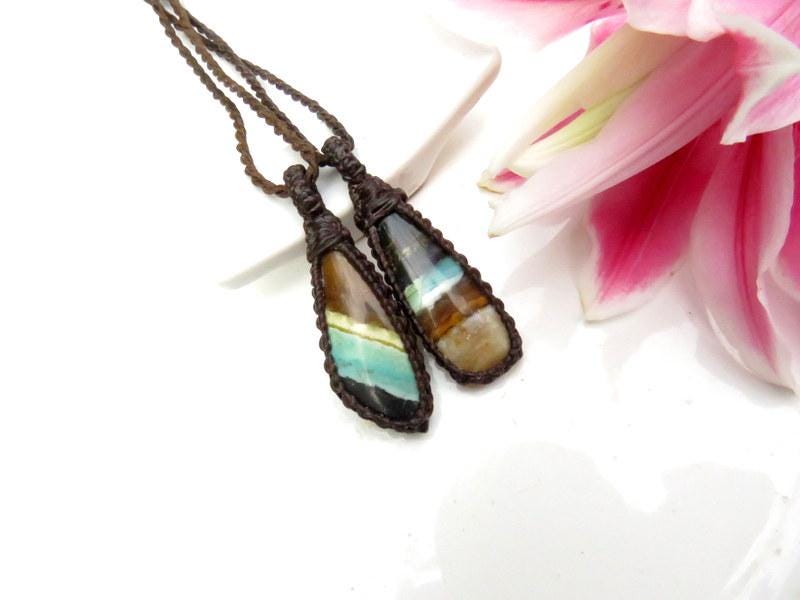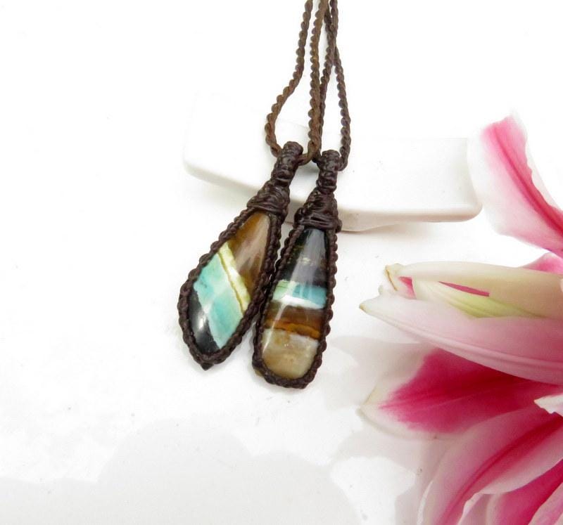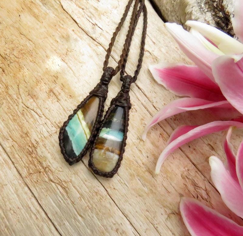 This listing is for TWO necklaces - Rare Opalized Petrified Wood gemstone necklace set - Petrified Wood with Blue Opal was first found as pebbles and larger rounded stones (“cobbles”) in streams and near the slopes of three volcanoes in Indonesia’s West Java Province. What the miners actually found was an ancient petrified forest (how cool is that?), which had been pushed over by a volcanic explosion. Then, over the ages, the wood was fossilized and preserved by opaline silica. A wonderful addition to the rock collector's collection! **Our necklace sets can be worn layered together or worn separately! The perfect gift idea for soulmates and/or besties. In the listing photos, we are showing the set with the 18 (16) inch and 22(20) inch cord. If you wish for different lengths, just send us a message with your preferences when you checkout.