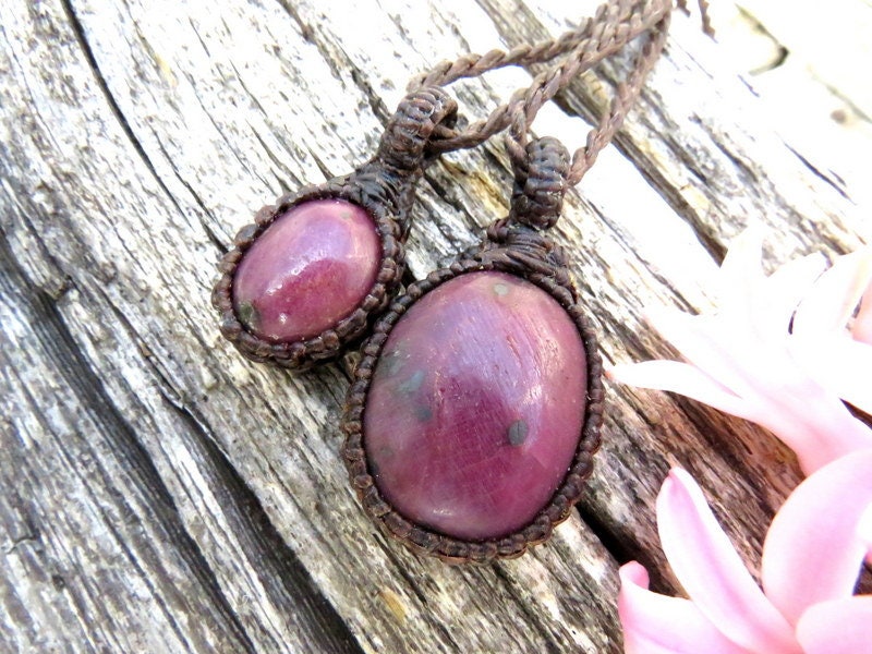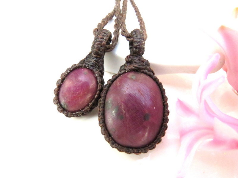 Materials: ruby, cabochon, gemstone, semiprecious stone, waxed cord.