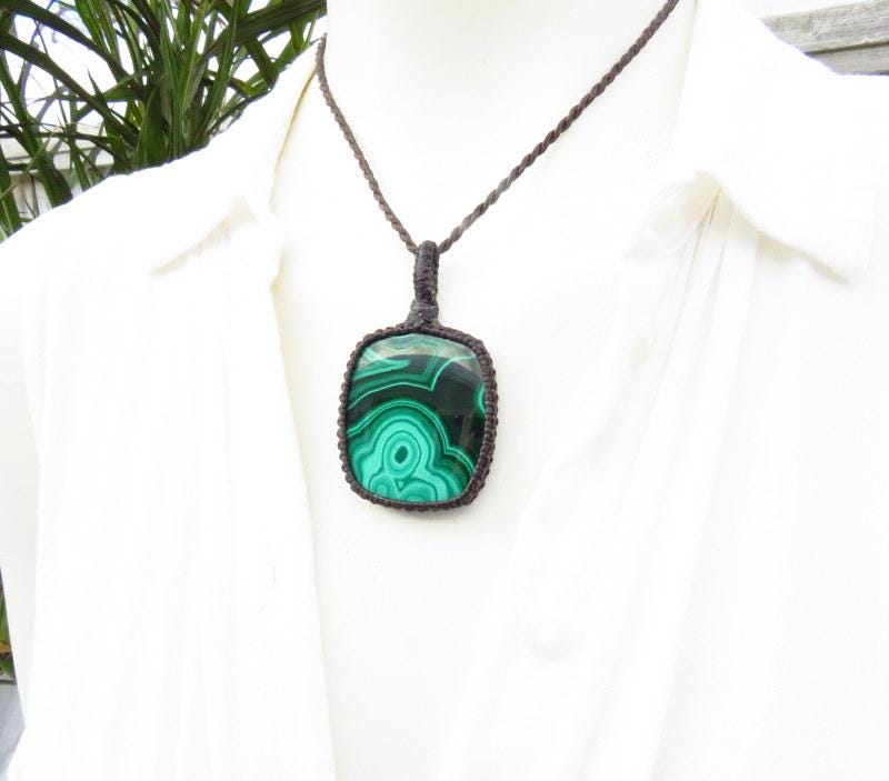 Materials: malachite, stone, cabochon, waxed cord.