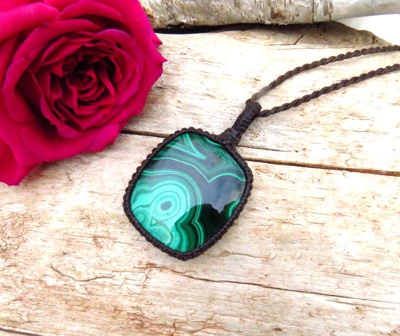 Superb quality Malachite macrame necklace - one of the most ancient gems - Its distinctive concentric layers, "eyes," banding and patterns- make it truly one of the most unique gemstones - This one is a vibrant green with very nice patterns - an excellent gemstone to support the heart chakra!