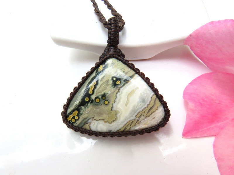 Unique Ocean Jasper macrame necklace - forest green and gray with pops of yellow orbs 🌊 A beautiful Ocean Jasper !