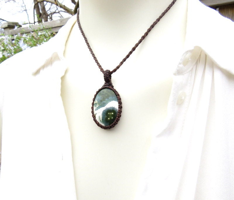 Unique Ocean Jasper macrame necklace - green with hues of blue and gorgeous patterns !