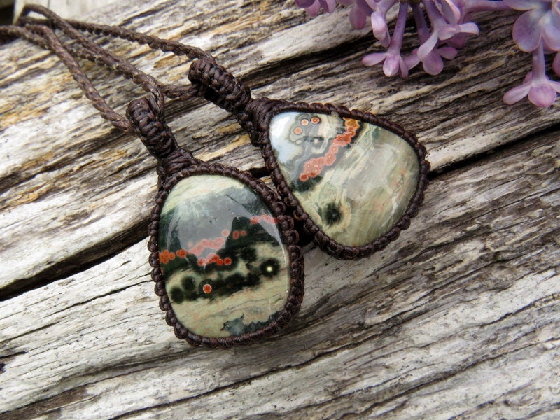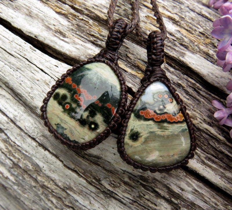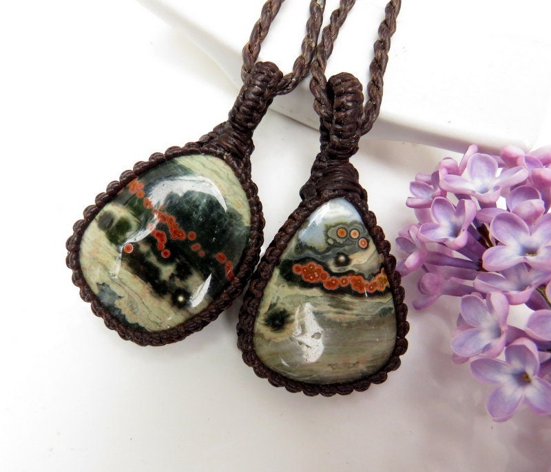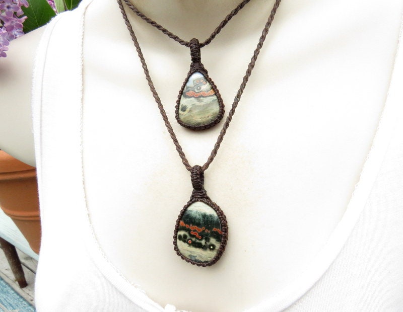 Unique Ocean Jasper necklace pair - You will receive TWO necklaces with this listing - two darling polka dot Ocean Jasper pieces ! Both are a beautiful deep green and gray with orange orbs 🧡 These pairs can be worn together or separately - a lovely idea for best friends and soul-mates - and also a great size for kids! *You will receive BOTH (2) pieces with the cord length of your choosing for each (if you wish for different lengths, please indicate in the 'notes to seller' box in your cart or send us a message! ) In the listing photos, we are showing the 18 inch and 22 inch cords.