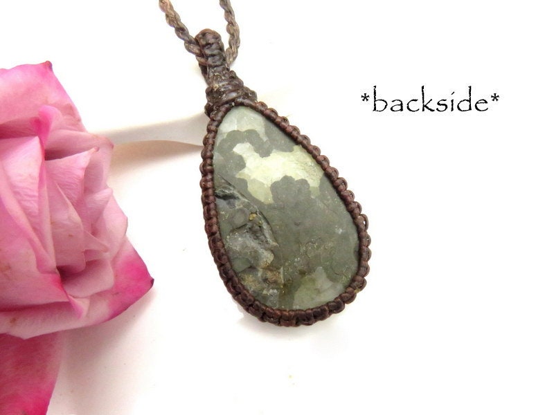 Rare and beautiful pyritized Ammonite macrame necklace - Ammonites are fossilized oceanic creatures that lived in the ocean approximately 400 million years ago. This is an Ammonite shell that is 'pyritized' or, rather, pyrite has migrated along the chambers of the Ammonite shell. As this is considered a rare occurrence in nature, Ammonite-pyrite is an incredible piece to add to your gemstone collection ! One of a kind ✨