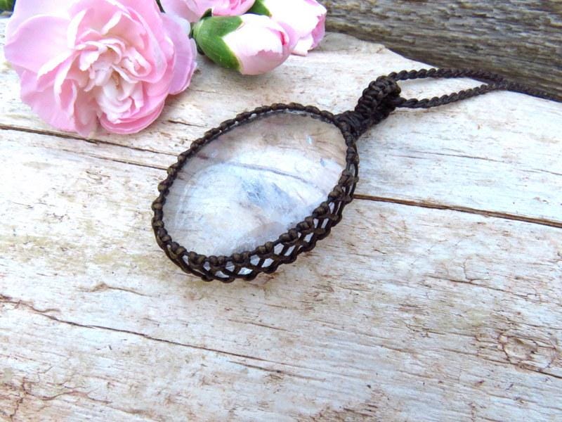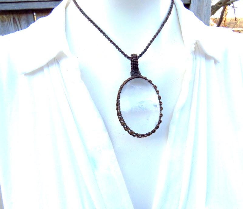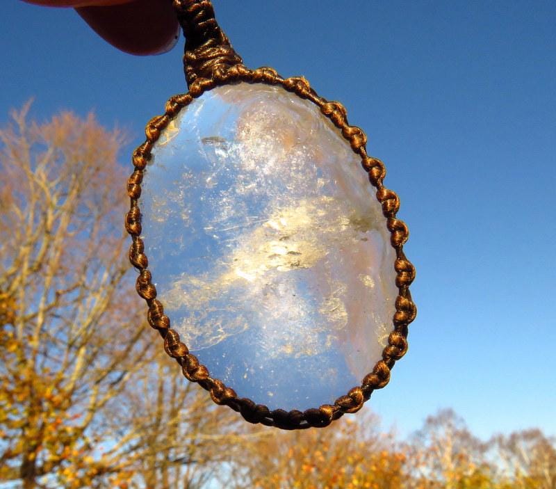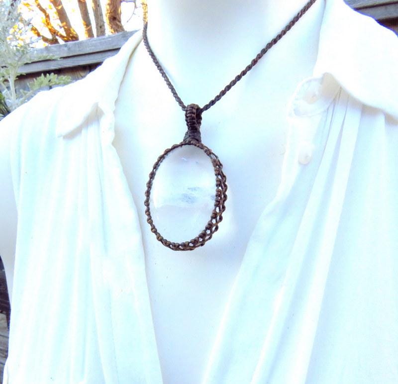 Stunning Quartz crystal macrame necklace -tingling with excitement to find its new owner, this gorgeous palm size Quartz crystal has fascinating, ethereal inclusions . Wrapped 100 % securely using the art of knot -tying or 'macrame.' Excellent vibrations. Clear Quartz is a wonderful healing tool !
