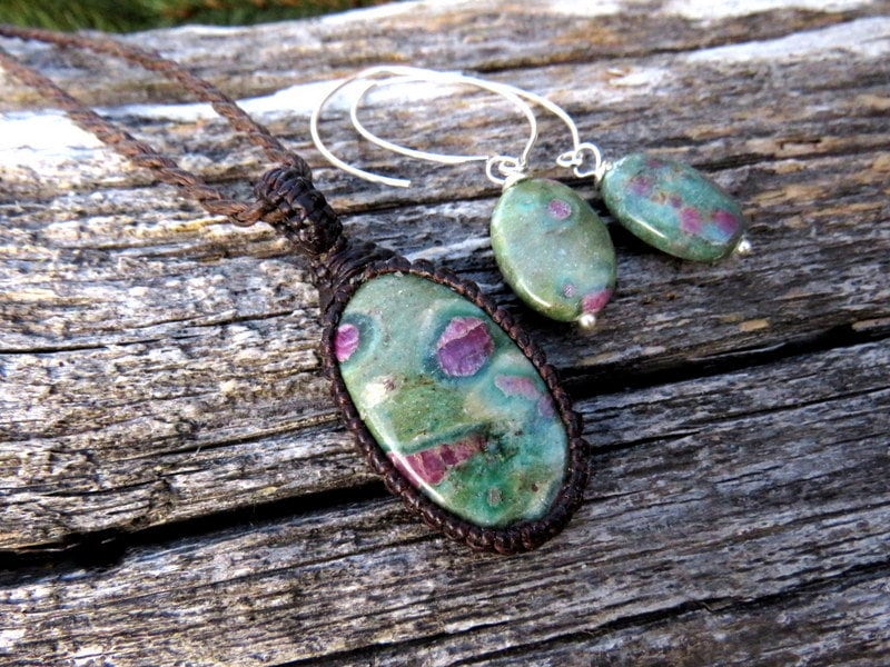 🌺Symbolizes " YOUTHFUL VITALITY "🌺 This listing is for a sweet Ruby Fuchsite necklace and earring set. Ruby in Fuchsite is exactly how it sounds ; gorgeous rubies contained within the mineral Fuchsite ( Muscovite) - These Ruby Fuchsite gemstones are dotted with ruby 'roses' - nestled against a lovely, soft green background -