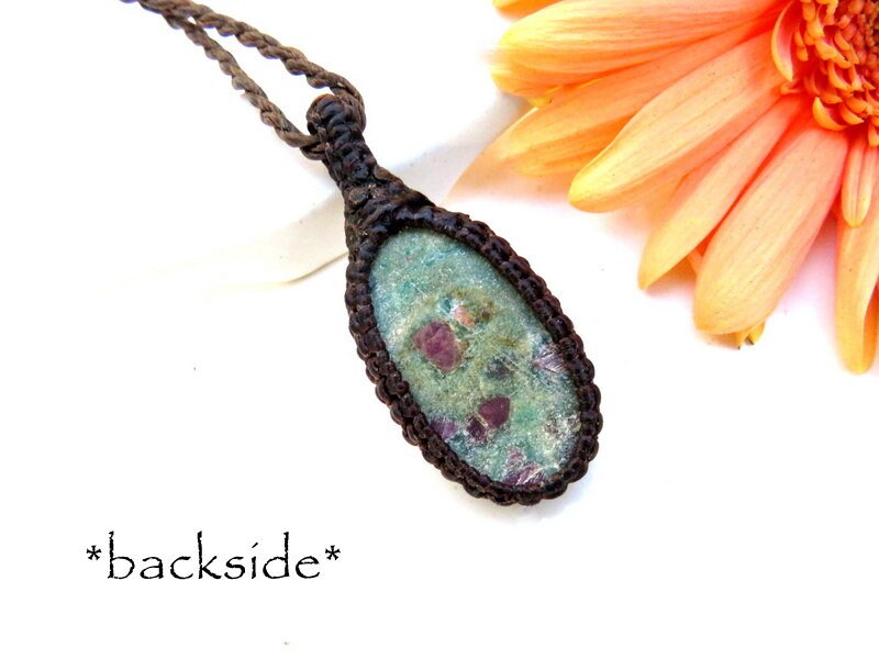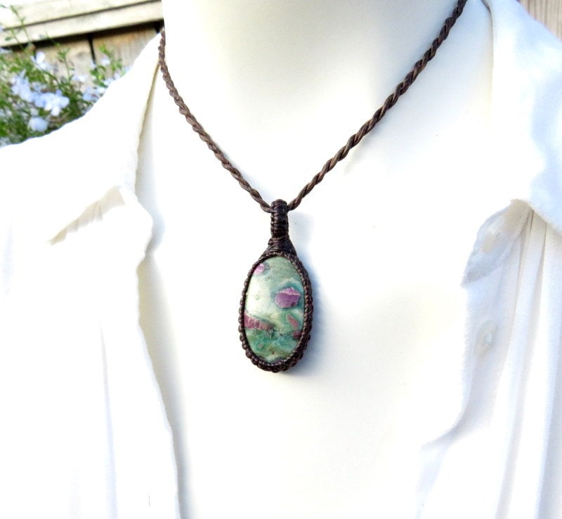 Materials: gemstones, ruby fuchsite, semiprecious stones, ruby in fuchsite, waxed cord.