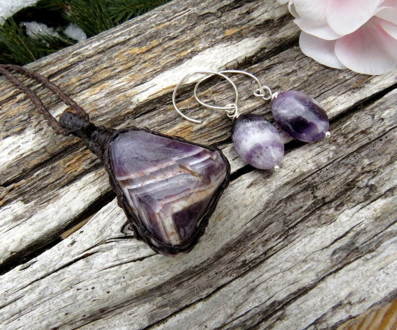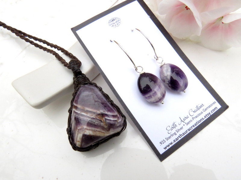 This listing is for 1 pair of Amethyst gemstone sterling silver earrings + 1 gorgeous Chevron Amethyst macrame necklace - beautiful, glorious purple..The perfect Valentines Day gift ! *Earrings are .925 Sterling Silver.