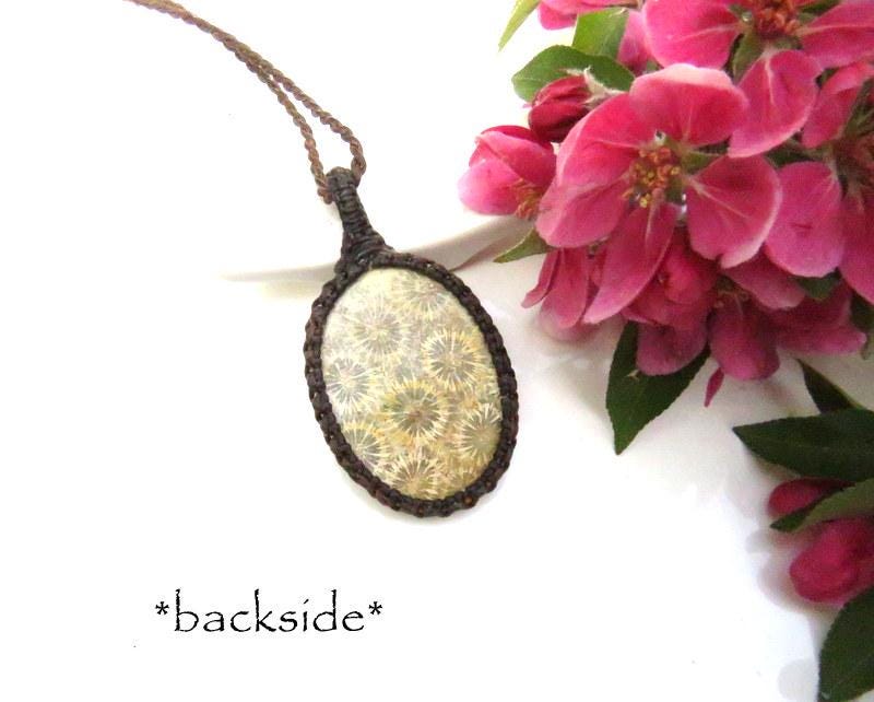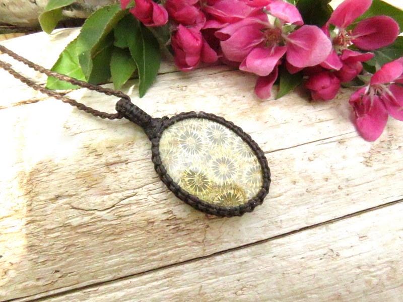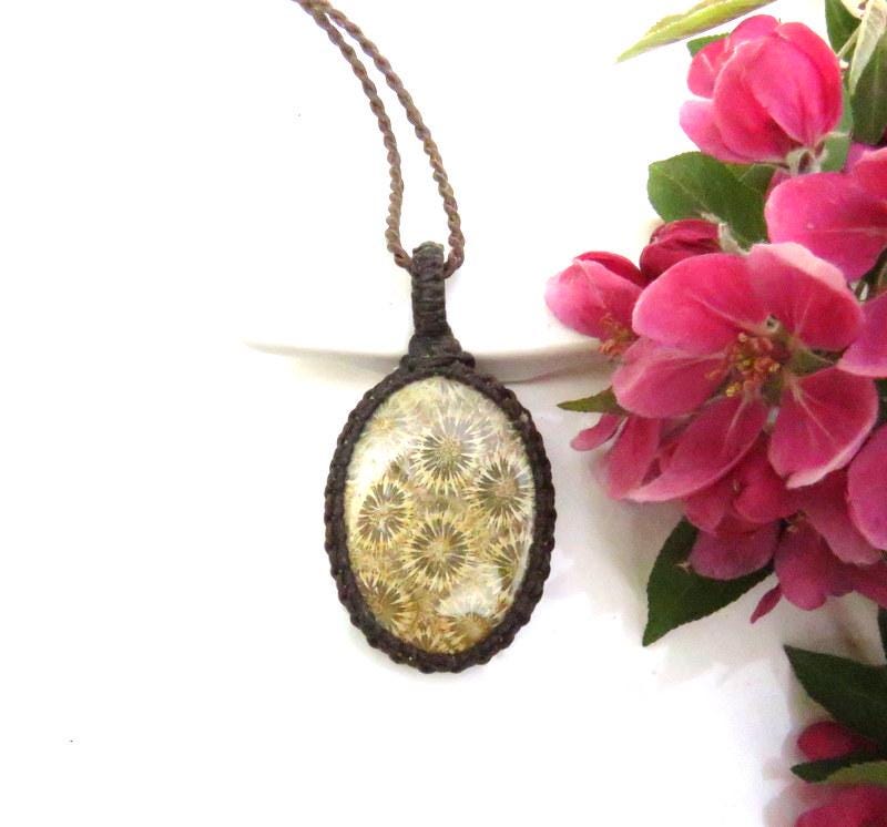 🌞HAPPINESS & HARMONY - Exceptional Quality Agatized Coral macrame necklace - Agatized Coral pieces are the remains of primal reefs that grew in the warm coastal waters of ancient oceans - the flower-like patterns are the tiny bits of fossilized coral ! Yellow- beige and dotted with crisp 'florets' of coral.