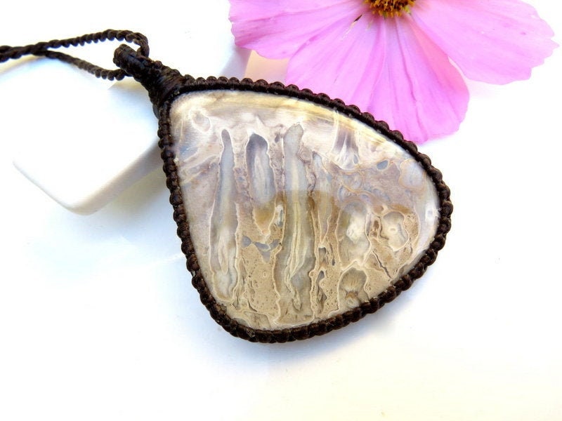 A unique find! Petrified PalmWood macrame necklace - From Indonesia - these pieces are rare ! Unique butterfly wing shaped Petrified Wood - gorgeous material !